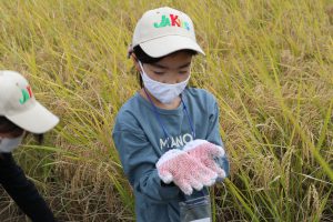 犬山市子ども大学第7講座「稲刈り体験」 10月22日、犬山市子ども大学の第7講座として稲刈り体験を行いました。 犬山市で農業を営む寺澤克己さんの指導のもと「あいちのかおり」の生育に必要な作業について学んだ後、鎌を使って丁寧に稲を刈り取りました。 収穫した稲は乾燥、脱穀し玄米の状態で参加者にプレゼントされます。 犬山子ども大学では、JA愛知北営農生活課職員が講師となり1年を通して講座を開きます。 次回は、11月19日にみかんの収穫体験を行います。