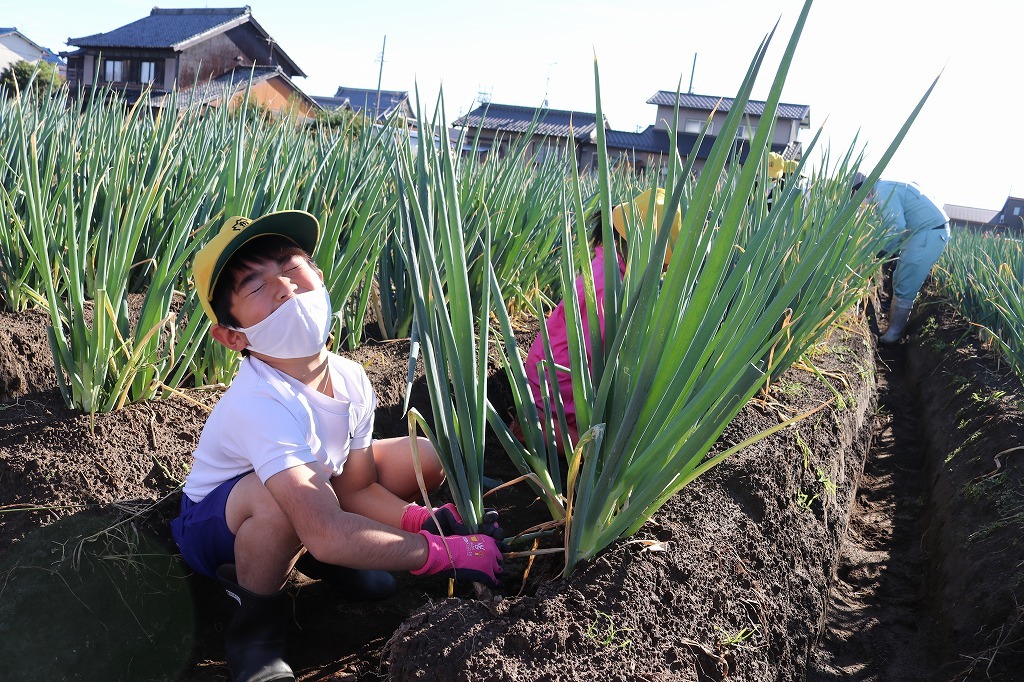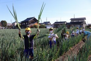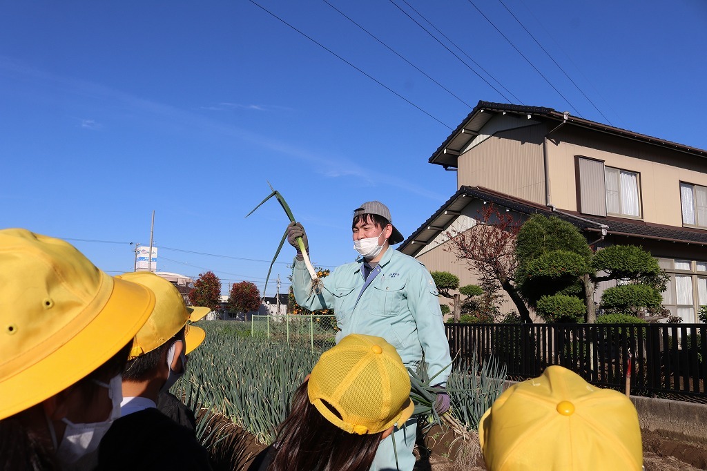 布袋小「越津ねぎ収穫体験」 11月25日にアイファームの畑で江南市立布袋小学校の3年生114人が「越津ねぎ」の収穫体験を行いました。 布袋支店営農生活課の蜂谷営農指導員より「越津ねぎ」についての説明と収穫方法を学んだ後、立派に育ったネギを1人1株、楽しく収穫しました。