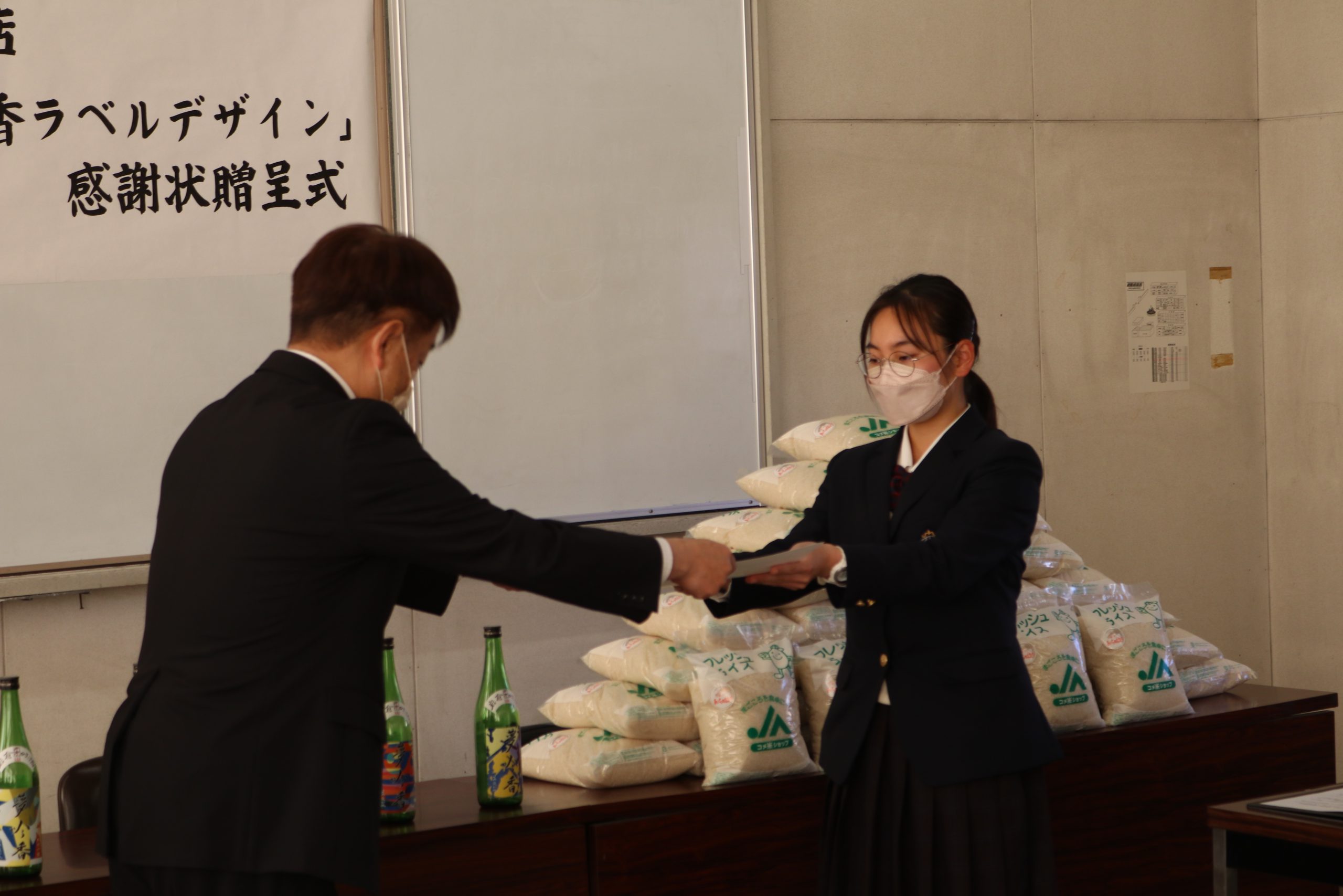 令和4年度「夢吟香」ラベル完成披露と感謝状・記念品贈呈式 12月23日、愛知県立岩倉総合高等学校にで生徒らがデザインした酒造好適米を使った日本酒「夢吟香」のラベル6種類の完成披露と制作に対する感謝状と記念品「岩倉産あいちのかおり3キロ」の贈呈式が行われました。 生徒らは「アート演習A」「書道Ⅱ」の授業の中でデザインを制作しました。 文字1点と色鮮やかなイラスト6点が選ばれ、岩倉支店の石黒文浩支店長が感謝状を贈呈しました。 限定ラベルの「夢吟香」は1本(720ml)1,650円(税込)で、岩倉支店と産直センター岩倉店にて販売しています。