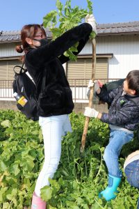 職員のアドバイスを聞き左右に揺らしながら引き抜き、30本以上収穫した参加者もいて、小さいな、お子さんは自分の背丈よりも長い大根を掘り当てると大喜びでした。